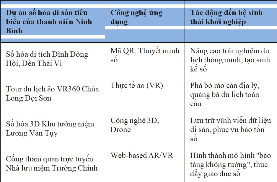 Thanh niên Ninh Bình đang đóng vai trò "kiến trúc sư số" trong việc bảo tồn và quảng bá di sản. Hoạt động số hóa các "địa chỉ đỏ" và di tích lịch sử không chỉ là công tác tuyên truyền mà đã trở thành một mảng khởi nghiệp sáng tạo tiềm năng trong ngành kinh tế di sản. Thông qua việc lắp đặt mã QR tại hơn 200 di tích lịch sử, văn hóa, tuổi trẻ Ninh Bình đã tạo ra một hệ thống thuyết minh đa phương tiện, giúp du khách dễ dàng tra cứu thông tin chính thống.