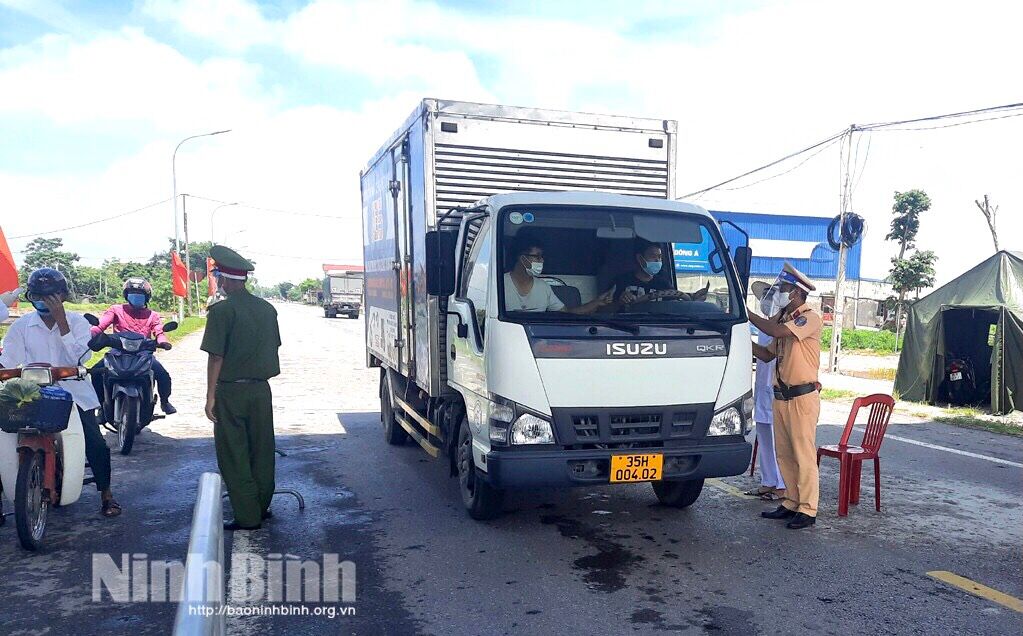 Kiểm soát phương tiện vào địa bàn huyện Kim Sơn tại chốt khu vực cổng chào huyện Kim Sơn trên QL 10.
