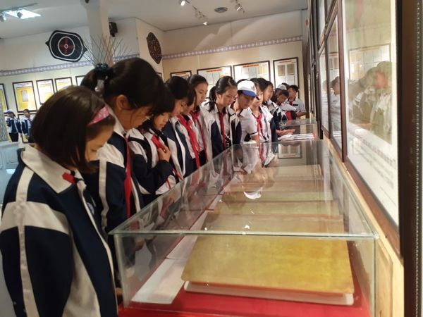 Các em học sinh xem bản đồ, tư liệu tại Bảo tàng Kon Tum. Ảnh: Bá Nha