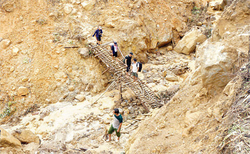 Tạm chia tay cầu tạm Thẳm Có, chúng tôi bám theo người dân ra nhận hàng cứu trợ để vượt qua Vàng Ngần, đi sâu vào An Lương - xã xa nhất và là địa bàn cuối cùng xe cơ giới chưa thể tiếp cận. Càng lên cao, đường đi càng hẹp, trơn trượt giữa một bên là vách núi dựng đứng, một bên là vực sâu hun hút. Sau hơn 3 tiếng rưỡi lội bùn, leo dốc liên tục, chúng tôi mới tiếp cận được trung tâm xã An Lương.