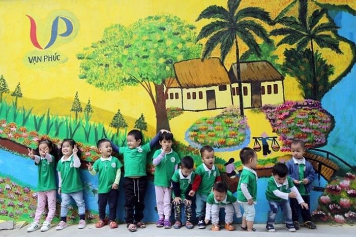 Các bé mầm non ghi lại hình ảnh bên bức tường bích họa. (Ảnh: Internet)