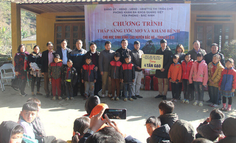 Đây là 2 xã khó khăn của huyện Bắc Hà với gần 100% dân số là người dân tộc thiểu số. Tại mỗi xã, đoàn tặng 4 tấn gạo và chăn, quần áo, bánh kẹo cho học sinh các cấp học. Các y, bác sỹ Phòng khám đa khoa Quang Việt khám sàng lọc (đo chiều cao, cân nặng; khám thị lực; nội khoa; soi tai, mũi họng; siêu âm); cấp thuốc theo bệnh miễn phí; tư vấn sức khỏe cho hơn 400 học sinh.