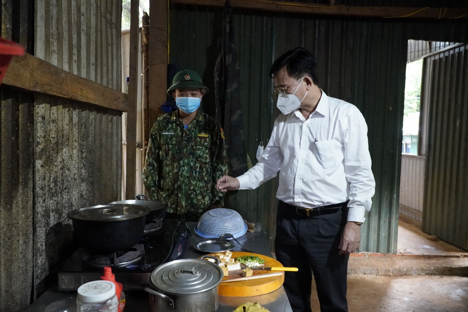 Kiểm tra bữa ăn của các chiến sĩ tại chốt kiểm soát dịch biên giới.
