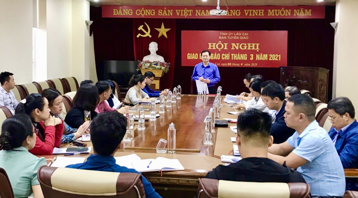 Căn cứ vào các nhiệm vụ chính trị của tỉnh trong tháng 4/2021, đồng chí Phó trưởng Ban Tuyên giáo Tỉnh ủy đề nghị các cơ quan báo chí, bản tin cần bám sát sự chỉ đạo, định hướng tuyên truyền để phản ánh liên tục, sâu rộng, đáp ứng nhu cầu thông tin của cán bộ, đảng viên và nhân dân. Trong đó chú trọng tuyên truyền đậm nét về các hoạt động hướng tới bầu cử đại biểu Quốc hội khóa XV và đại biểu Hội đồng nhân dân các cấp nhiệm kỳ 2021-2026. Tiếp tục phản ánh việc triển khai học tập nghị quyết đại hội đảng các cấp, nhất là học tập nghị quyết Đại hội XIII của Đảng; tuyên truyền đầy đủ, toàn diện, kịp thời nhiệm vụ chính trị, kinh tế - văn hóa - xã hội, quốc phòng - an ninh, đối ngoại, các ngày lễ và kỷ niệm của đất nước và của tỉnh. Tuyên truyền việc thực hiên các dự án, đề án, các giải pháp thực hiện mục tiêu kép vừa phòng chống dịch COVID-19 vừa phát triển kinh tế; tăng cường đấu tranh phản bác luận điều sai trái, xuyên tạc của các thế lực thù địch. Chỉ đạo, hướng dẫn, động viên, giao chỉ tiêu cho đội ngũ phóng viên, nhà báo, văn nghệ sĩ viết bài tham gia Cuộc thi báo chí, bút ký văn học viết về những tấm gương sáng tạo điển hình của Lào Cai trong 30 năm tái lập và phát triển (01/10/1991 - 01/10/2021)./.
