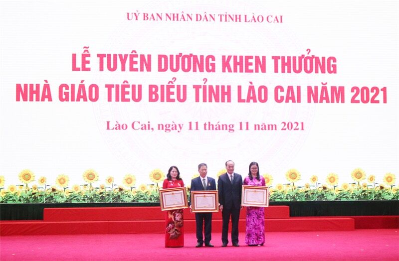Tại Lễ tuyên dương khen thưởng, thừa ủy quyền của Chủ tịch nước, đồng chí Vũ Xuân Cường - Phó Bí thư Thường trực Tỉnh ủy và các đồng chí lãnh đạo Tỉnh ủy, HĐND, UBND đã trao tặng danh hiệu Nhà giáo ưu tú cho 3 nhà giáo có thành tích xuất sắc, liên tục trong nhiều năm qua và có nhiều đóng góp tích cực cho ngành giáo dục Lào Cai; tặng thưởng Huân chương Lao động hạng nhất cho 1 tập thể và 1 cá nhân; tập thể Sở Giáo dục và Đào tạo tỉnh Lào Cai được nhận Cờ thi đua của Bộ Giáo dục và Đào tạo; 3 tập thể và 32 cá nhân được nhận Bằng khen của Bộ trưởng Bộ Giáo dục và Đào tạo; 31 tập thể tiêu biểu được nhận Cờ thi đua của UBND tỉnh Lào Cai; 22 tập thể được trao tặng danh hiệu tập thể lao động xuất sắc, tập thể tiêu biểu; Trao tặng huy hiệu "Vì sự nghiệp xây dựng và phát triển tỉnh Lào Cai năm 2021 của Chủ tịch UBND tỉnh Lào Cai cho 9 cá nhân; 20 tập thể, 118 cá nhân được nhận Bằng khen của Chủ tịch UBND tỉnh Lào Cai; tặng Bằng khen cho 4 cá nhân ngoài ngành giáo dục đã có đóng góp xuất sắc cho sự nghiệp phát triển giáo dục của tỉnh.