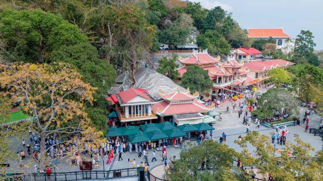 Ở độ cao gần 1.000 m, đỉnh Núi Bà Đen những ngày đầu năm mới trở thành tâm điểm thu hút du khách đến tham quan, chiêm bái. Tính từ Mùng 1 Tết, mỗi ngày có hàng nghìn lượt khách đi cáp treo lên núi Bà Đen, hành hương tại hệ thống chùa Bà cổ kính gắn liền với huyền thoại Linh Sơn Thánh Mẫu Bồ Tát. Trên đỉnh núi là hệ thống các công trình văn hoá tâm linh kỳ vĩ, nổi bật với Tượng Phật Bà Tây Bổ Đà Sơn bằng đồng cao nhất châu Á trên đỉnh núi, tôn tượng Di Lặc Bồ Tát bằng đá sa thạch lớn hàng đầu thế giới. Đặc biệt năm nay, tôn tượng Đức Phật Câu Na Hàm Mâu Ni trong sắc vàng hoàng kim trở thành tâm điểm trên đỉnh núi, nơi du khách chiêm bái và dâng lời nguyện ước về năm mới tài lộc, thịnh vượng.