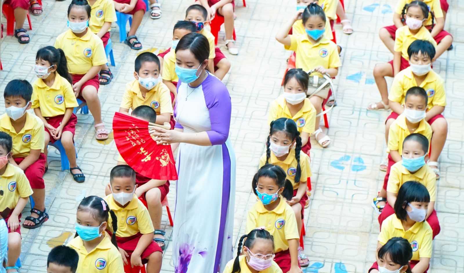 Cô giáo chủ nhiệm quạt mát cho các em học trong thời tiết oi bức