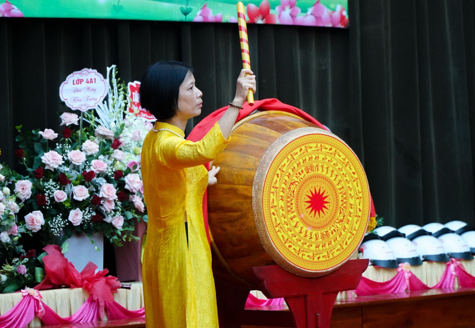 Nhà giáo Vũ Thị Thúy Vân, Bí thư Chi bộ, Hiệu trưởng trường Tiểu học Phạm Hồng Thái đánh trống khai giảng năm học mới 2020-2021
