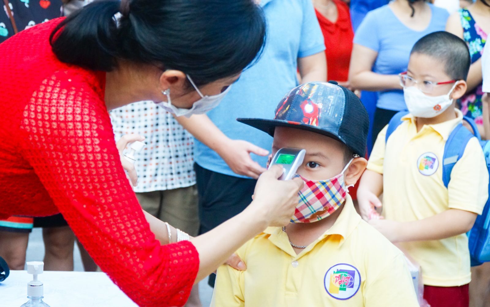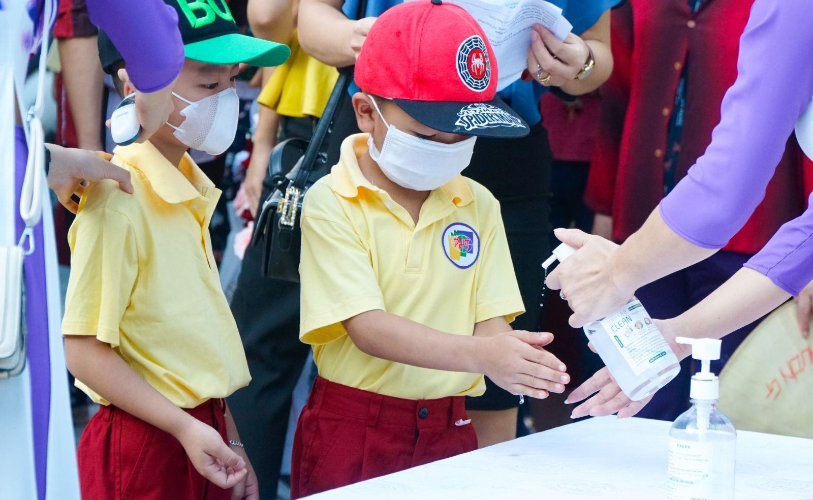 Công tác đón học sinh trong ngày tựu trường được thực hiện nghiêm túc. Ngay tại cổng trường, toàn bộ học sinh được đo thân nhiệt và rửa tay bằng dung dịch sát khuẩn.