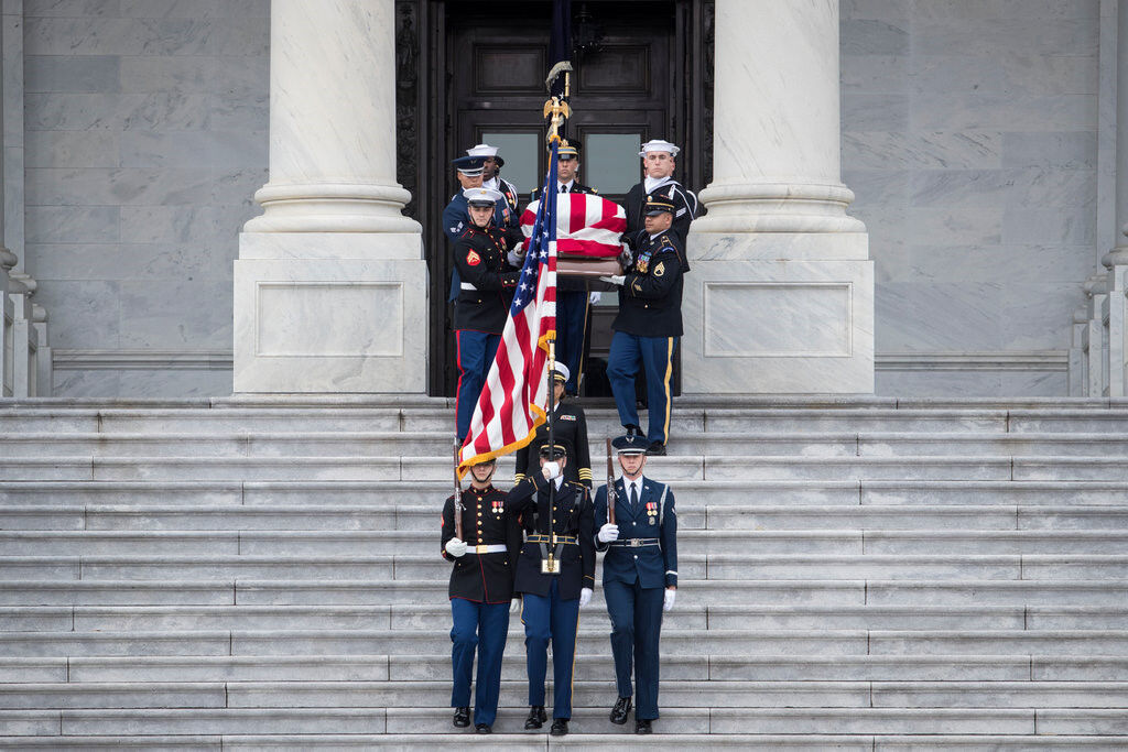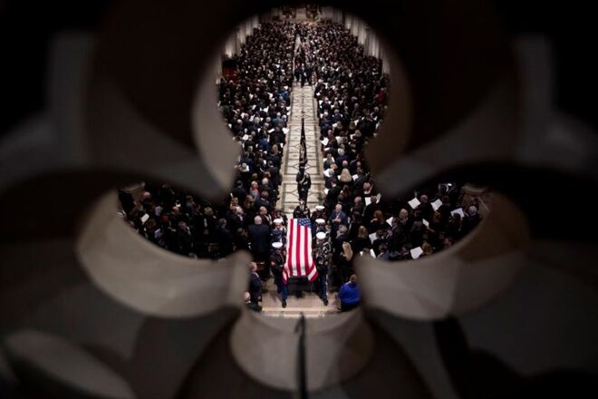 Ngày 5/12 được tuyên bố là ngày quốc tang của Mỹ, nhiều văn phòng chính phủ và thị trường chứng khoán nước này đã đóng cửa. Trước đó, từ ngày 3/12, linh cữu của cựu tổng thống Bush “cha” được đặt dưới Mái vòm Rotunda ở Điện Capitol, tòa nhà quốc hội Mỹ. Ảnh: AP