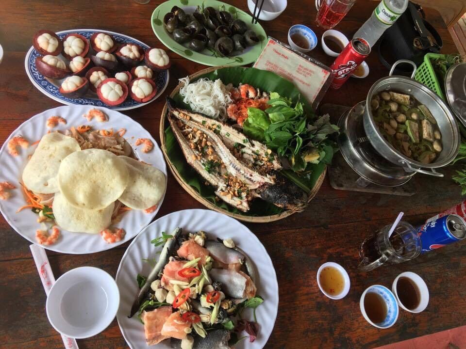 Không chỉ cuốn hút du khách bởi khung cảnh hữu tình, thơ mộng, mà còn hấp dẫn du khách bởi các món ăn, dân dã đồng quê như cá lóc nướng trui, heo mọi quay lu, gà hấp củ lùn (hoặc lá chúc, ấu) lẩu cua đồng, lẩu mắm đồng quê…Đặc biệt còn có những món ăn theo mùa như: bông sầu riêng xào, gỏi măng cụt, gỏi chôm chôm, gỏi bưởi hay tép rong bông điên điển..