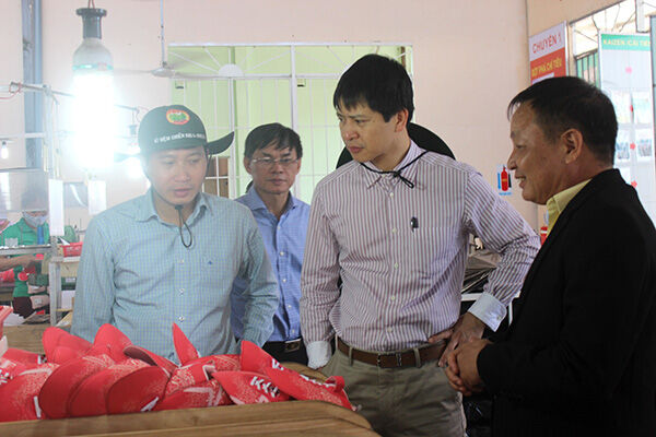 Ông Nguyễn Quang Vũ (bìa trái), Giám đốc Công ty TNHH Nam Bình Minh giới thiệu về sản phẩm của doanh nghiệp với khách tham quan.