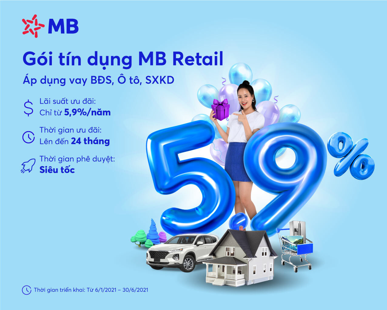 Năm 2020 với nhiều khó khăn và biến động của nền kinh tế đã ảnh hưởng ít nhiều đến tài chính của các cá nhân và doanh nghiệp. Với mong muốn đồng hành cùng khách hàng để phục hồi sau Covid, MB đã triển khai Gói tín dụng ưu đãi “MB Retail năm 2021” áp dụng cho khách hàng cá nhân đến hết 30/6/2021 với quy mô 50.000 tỷ với lãi suất siêu ưu đãi.