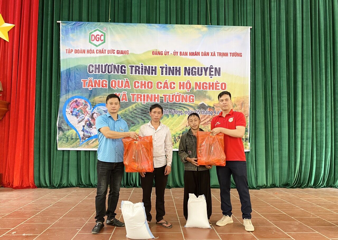 Trước sự chứng kiến của các vị đại biểu lãnh đạo huyện, lãnh đạo Phòng Giáo dục, Công an huyện, lãnh đạo Đảng ủy, UBND xã Trịnh Tường, đại diện cơ quan Thường trú Tây Bắc của Tạp chí Việt Nam hội nhập, đồng chí Nguyễn Hùng Cường - Phó giám đốc Công ty Hóa chất Đức Giang Lào Cai, đồng chí Đoàn Văn Tính - Chủ tịch Công đoàn Công ty đã đại diện cho Tập đoàn Hóa chất Đức Giang cùng một số đoàn viên công đoàn Công ty trao tận tay 100 xuất quà, mỗi xuất trị giá 495 000đ, gồm 1 ba lô học sinh, áo và sách vở cho học sinh trường Tiểu học và trường Trung học cơ sở xã Trịnh Tường, 271 xuất quà,mỗi xuất trị giá 240 000đ, gồm 10 kg gạo tẻ, một hộp mì tôm, một chai dầu ăn, 1 túi mì chính, một túi bột giặt cho các hộ gia đình khó khăn trong xã, tổng số 371 xuất quà Đại diện Tập đoàn đã trao trị giá 115 360 000đ.