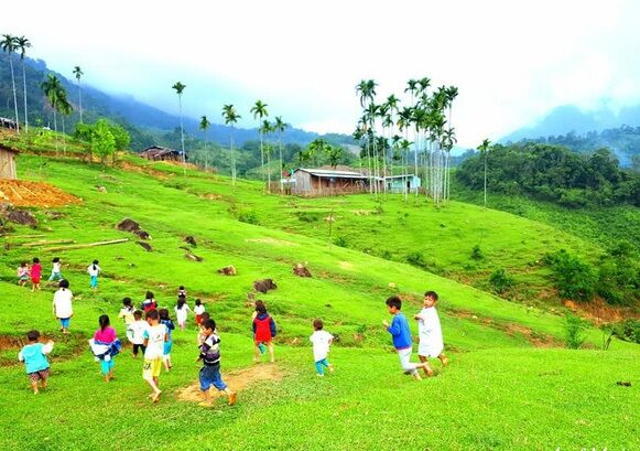 "Trường của em be bé, nằm lặng giữa rừng cây".