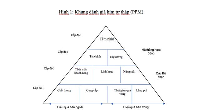 Các tầng của kim tự tháp bao gồm: Cấp độ 1 – phản ánh tầm nhìn hoặc sứ mệnh mà tổ chức mô tả cách nó sẽ đạt được thành công trong dài hạn và lợi thế cạnh tranh của tổ chức. Cấp độ 2 – tập trung vào việc đạt mục tiêu của tổ chức theo các biện pháp thị trường và các biện pháp tài chính. Cấp độ 3 – phản ánh các chiến lược thị trường và tài chính ở cấp độ 2 được đặt trong mối liên kết với sự hài lòng của khách hàng, tăng tính linh hoạt và năng suất cao ở cấp độ tiếp theo. Cấp độ 4 – là tình trạng cấp độ 3 có thể được theo dõi bằng cách sử dụng các chỉ số về chất lượng, thời gian giao hàng, thời gian chu kỳ và lãng phí. Phía bên trái của kim tự tháp phản ánh các biện pháp bên ngoài và phi tài chính; bên phải tập trung vào hiệu quả nội bộ của tổ chức và chủ yếu là tài chính. Cần lưu ý rằng, mô hình đánh giá hiệu quả kim tự tháp nhược điểm là nó có xu hướng tập trung vào hai nhóm liên quan: người sở hữu và khách hàng nhằm bảo đảm rằng, các biện pháp liên quan đến các bên liên quan là phù hợp2.