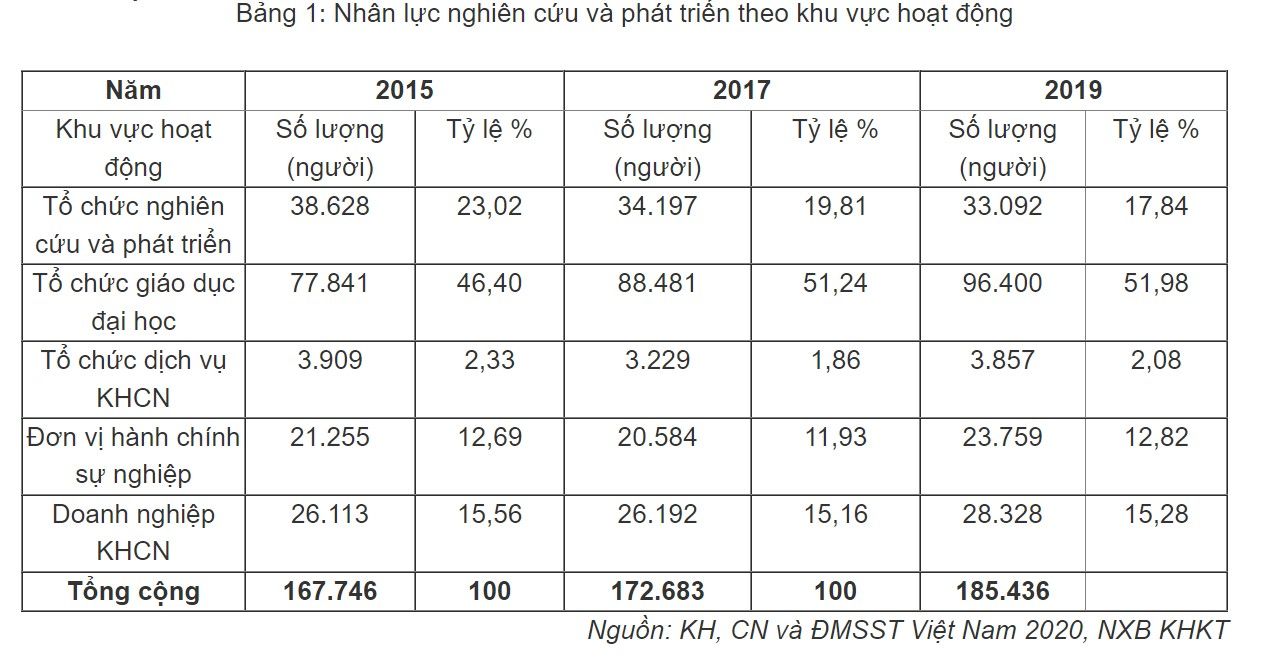 Bảng số liệu này cho thấy, tính đến năm 2019, cả nước có 185.436 người tham gia các hoạt động nghiên cứu và phát triển (NC&PT), tăng gần 13.000 người (gần 7,4%) so với năm 2017. Trong đó, đa số nhân lực làm việc trong các tổ chức giáo dục đại học với trên 96.400 nhân lực (chiếm gần 52% năm 2019), tiếp đến là các tổ chức nghiên cứu và phát triển với trên 33.092 lao động (chiếm 17,84% năm 2019) và các doanh nghiệp KHCN với 28.328 lao động (chiếm 15,25% năm 2019). Xu hướng biến động nhân lực cho thấy lao động trong hệ thống giáo dục đại học tăng lên cả về số lượng và tỷ trọng trong khi tỷ trọng lao động trong các tổ chức nghiên cứu và phát triển có xu hướng giảm cả về số lượng và tỷ trọng. Một điều đáng mừng là số lượng nhân lực làm việc trong các doanh nghiệp KHCN và các tổ chức dịch vụ KHCN cũng có xu hướng tăng lên về số lượng qua các năm. Đây là một dấu hiệu tốt, là nguồn lực quan trọng để xây dựng hệ thống đổi mới sáng tạo quốc gia trong đó DN giữ vị trí trung tâm.