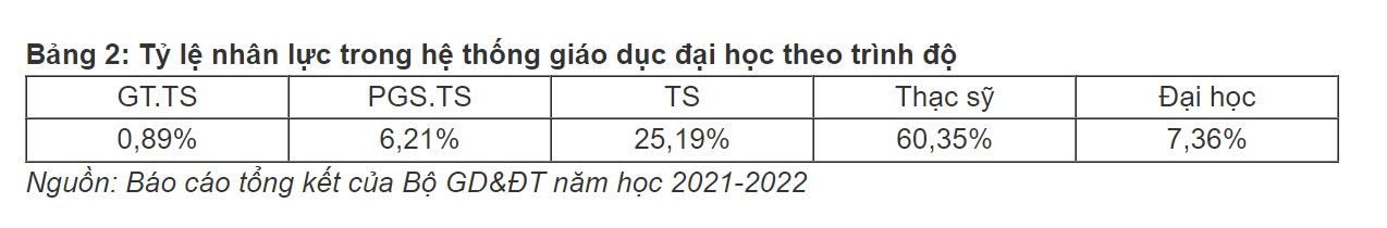 Theo báo cáo của Bộ KHCN, tính đến hết năm 2019, tỷ lệ nhân lực nghiên cứu có trình độ trên đại học (tiến sỹ, thạc sỹ) trong tổng số cán bộ nghiên cứu đã tăng từ gần 50% lên gần 57,3% (2019). Trong đó, tỷ lệ cán bộ nghiên cứu có trình độ cao (tiến sỹ) tăng nhanh từ khoảng 11 lên 15%. Xét theo cơ cấu về trình độ học vấn, trong hệ thống giáo dục đại học, số lượng nhân lực có trình độ từ tiến sỹ trở lên đã tăng qua các năm nhưng tỷ trọng nhân lực có trình độ GS.TS và PGS.TS năm học 2021-2022 là vô cùng khiêm tốn, tỷ trọng lao động có trình độ thạc sỹ chiếm đa số với trên 60 %. Nếu tính toàn bộ nhân lực có trình độ từ tiến sỹ trở lên chỉ đạt 32,29%, trong khi trình độ đại học cón chiếm đến 7,63%. Cụ thể như sau: