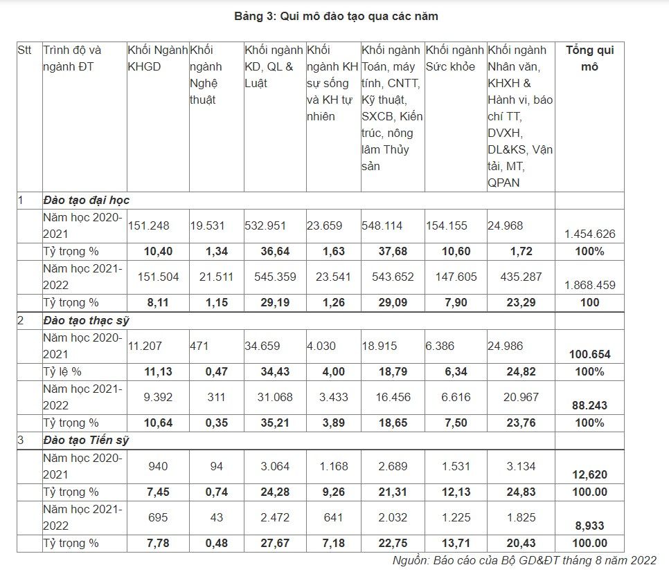 Bảng tổng hợp qui mô đào tạo trên đây cho thấy năm học 2021-2022, qui mô đào tạo khối ngành nhân văn, KHXH &Hành vi, báo chí tuyên truyền, dịch vụ xã hội, Du lịch, dịch vụ cá nhân, vận tải, môi trường và bảo vệ môi trường ở bậc đại học có sự gia tăng đột biến ( tăng 410.319 sinh viên trong toàn hệ thống, tăng 1.633% so với năm học 2019-2020). Trong khi đó, khối ngành giảm mạnh nhất là ngành sức khỏe với tổng qui mô đào tạo giảm là 6.550 sinh viên. Về đào tạo ở bậc thạc sỹ và tiến sỹ cũng có sự giảm mạnh trong 2 năm qua, đặc biệt là đào tạo tiến sỹ ở tất cả các khối ngành. Qui mô đào tạo chung ở bậc thạc sỹ giảm hơn 10 ngàn học viên trong khi ở bậc tiến sỹ giảm hơn 1500 NCS. Đây cũng là một thách thức không nhỏ báo hiệu một xu hướng thay đổi cơ cấu đội ngũ trí thức của Việt Nam trong thời gian tới theo ngành nghề và lĩnh vực hoạt động.
