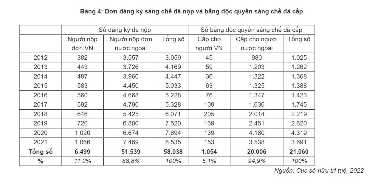 Trong thời gian vừa qua, đội ngũ tri thức Việt Nam đã đóng góp tích cực vào tăng trưởng kinh tế nói chung cũng như có đóng góp tích cực cụ thể trong việc sáng tạo, truyền bá và làm giầu tri thức cũng như tạo ra các sản phẩm có giá trị cho xã hội. Sự sáng tạo của đội ngũ tri thức được phần nào thể hiện qua số lượng các bằng sáng chế và độc quyền sáng chế không ngừng tăng qua các năm. Tính từ năm 2012 đến nay đã có trên 58.038 đơn đăng ký sáng chế đã nộp và 21.060 bằng sáng chế đã được cấp. Số lượng bằng sáng chế được cấp năm 2021 cao gấp gần 4 lần số bằng sáng chế được cấp năm 2012. Số đơn đăng ký sáng chế nộp năm 2021 tăng gấp gần 3 lần số đơn đăng ký sáng chế năm 2012. Điều này cho thấy năng lực sáng tạo của đội ngũ tri thức Việt Nam đã có sự cải thiện đáng ghi nhận. Đặc biệt trong giai đoạn đại dịch Covid diễn ra (3 năm 2019, 2020, 2021). Tuy nhiên, trong 10 năm qua, có thể thấy số lượng đơn đăng ký sáng chế của người nước ngoài chiếm 88,8%, cao hơn rất nhiều lần so với số đơn đăng ký sáng chế do người Việt Nam (11,2%). Số lượng bằng sáng chế được cấp của người nước ngoài đạt 20.006 (chiếm 94,9%) trong khi số bằng sáng chế được cấp của người Việt Nam chỉ đạt 1.054 (chiếm 5,1%). Điều này được thể hiện qua bảng 3 sau: