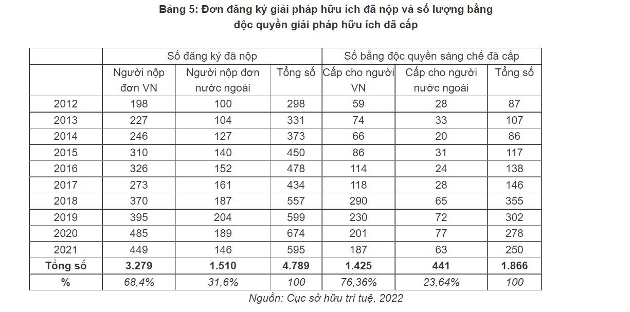 Bên cạnh đăng ký bằng sáng chế, số lượng các giải pháp hữu ích và bằng độc quyền giải pháp hữu ích đã được cấp cũng được xem là kết quả của sự sáng tạo của đội ngũ tri thức. Số lượng đơn đăng ký giải pháp hữu ích cũng tăng nhiều qua các năm tăng từ 298 đơn và 87 bằng độc quyền giải pháp hữu ích năm 2012 lên 595 đơn và 250 bằng độc quyền giải pháp hữu ích nâng tổng số đơn đăng ký giải pháp hữu ích đạt 14.789 đơn và 1.866 bằng độc quyền giải pháp hữu ích. Tuy nhiên, khác với bằng độc quyền sáng chế, tỷ lệ đơn đăng ký và bằng độc quyền giải pháp hữu ích lại chủ yếu vẫn thuộc về người Việt Nam. Tỷ trọng đơn đăng ký giải pháp hữu ích của người Việt Nam chiếm 31,6% và bằng độc quyền giải pháp hữu ích được cấp cho người Việt Nam là 76,36%. Điều này được thể hiện qua bảng 4 dưới đây: