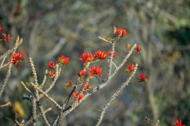 Bắt đầu nở rộ từ tháng 3 và kéo dài đến tận tháng 5, loài hoa này có đặc tính thú vị: khi ra hoa, cây trút sạch lá, chỉ còn lại những chùm hoa đỏ chói vươn thẳng lên trời. Hình dáng hoa tựa như móng rồng hay lưỡi liềm xếp chồng lên nhau, đầy kiêu hãnh giữa nắng gắt.