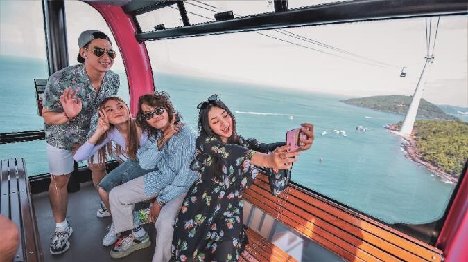 Bước chân lên cabin cáp treo, khung cảnh diễm lệ của trời biển chính là backdrop hoàn hảo cho những bức hình triệu like. Màu trời xanh lơ hòa với làn nước biếc, điểm tô bằng sắc cam hay xanh da trời và đỏ của đoàn thuyền đánh cá, muôn sắc màu của cuộc sống biển đảo dường như đều hội tụ tại đây.