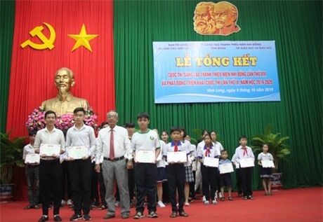 Ông Phạm Văn Hồng, Phó Giám đốc Sở GD- ĐT Vĩnh Long trao giải nhất cho các em học sinh tại cuộc thi Sáng tạo Thanh thiếu niên nhi đồng tỉnh Vĩnh Long năm 2019 vào ngày 5/10/2019. Thạch Huỳnh Vĩnh Nghi đứng ngoài cùng bên phải (hàng thứ nhất).