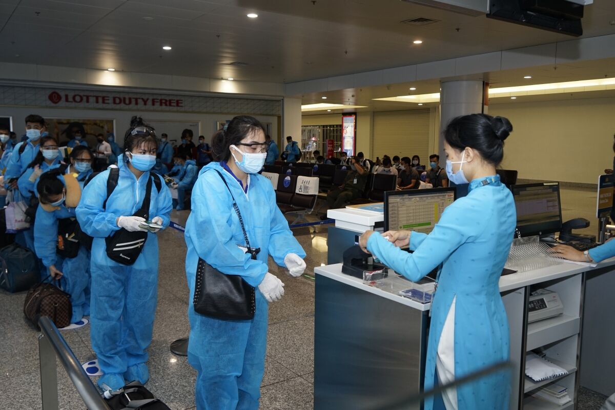 Nhân viên hàng không khuyến cáo hành khách thực hiện nghiêm các quy định phòng dịch - Ảnh: TTXVN
