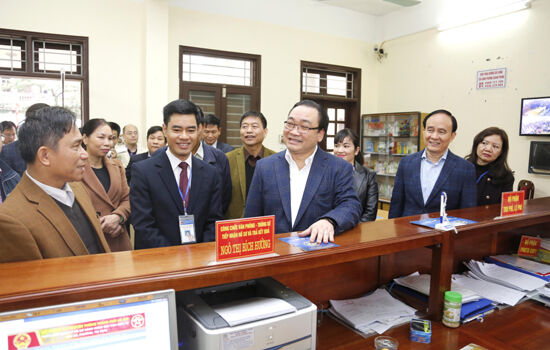 Bí thư Thành ủy Hoàng Trung Hải hỏi thăm người dân về làm thủ tục hành chính tại bộ phận Một cửa phường Quang Trung, thị xã Sơn Tây. Ảnh: Thanh Hải