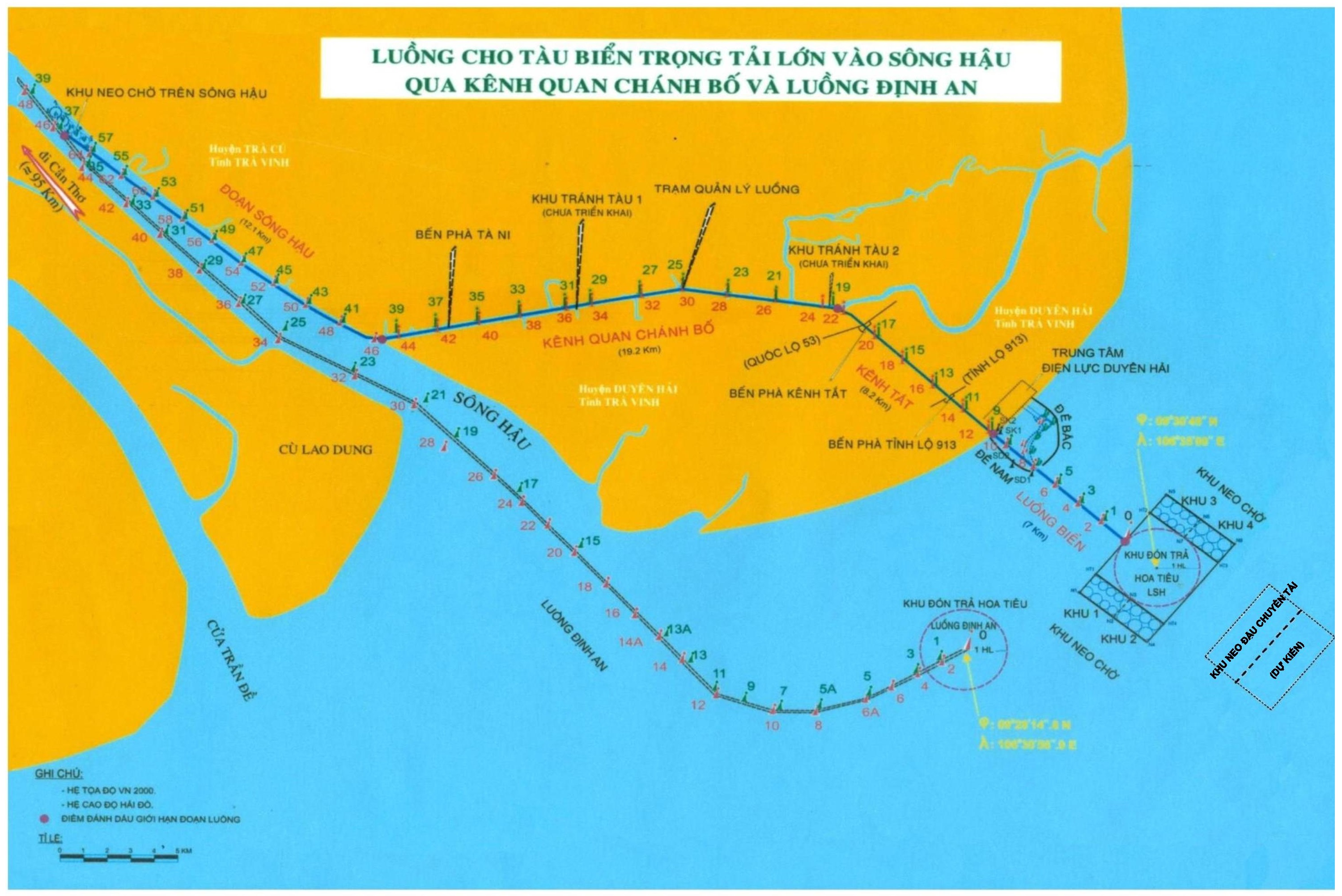 Hiện nay, tuyến luồng hàng hải ra vào các cảng biển trên sông Hậu bao gồm hai tuyến. Tuyến luồng thứ nhất, tuyến luồng hàng hải cho tàu biển trọng tải lớn vào sông Hậu (qua kênh Quan Chánh Bố) có tổng chiều dài 52,6km, cao độ đáy thiết kế -6,5m (hải đồ) tiếp nhận tàu trọng tải đến 10.000DWT đầy tải và 20.000DWT giảm tải.