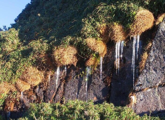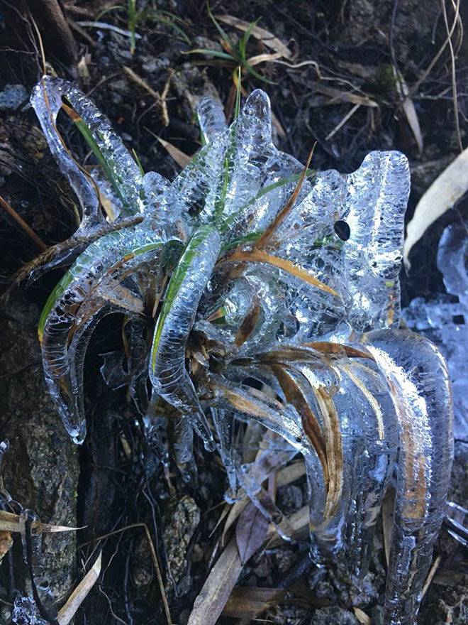 Sương, nước đọng lại tạo thành lớp băng mỏng bao phủ bề mặt cây cỏ