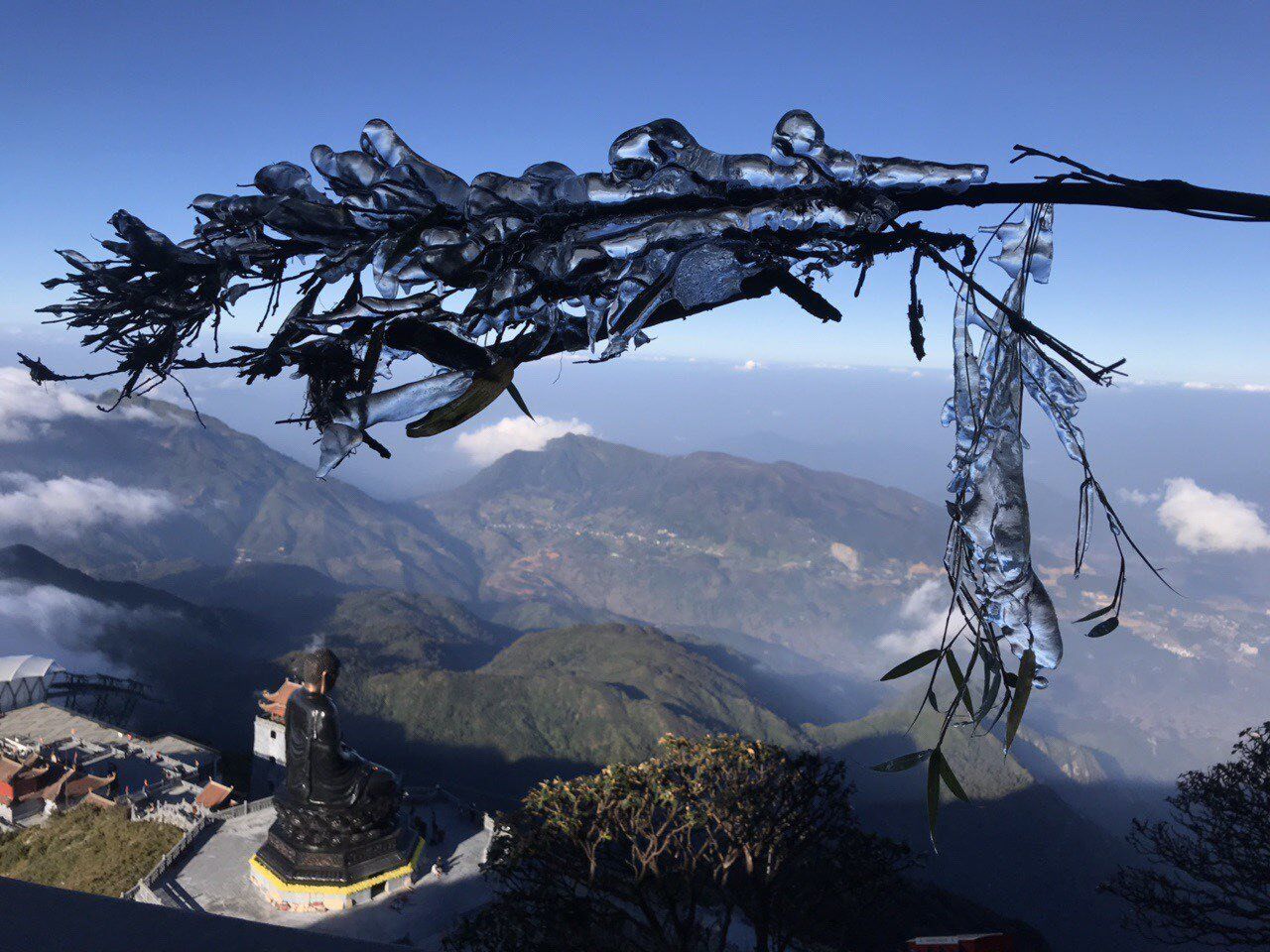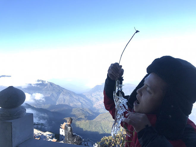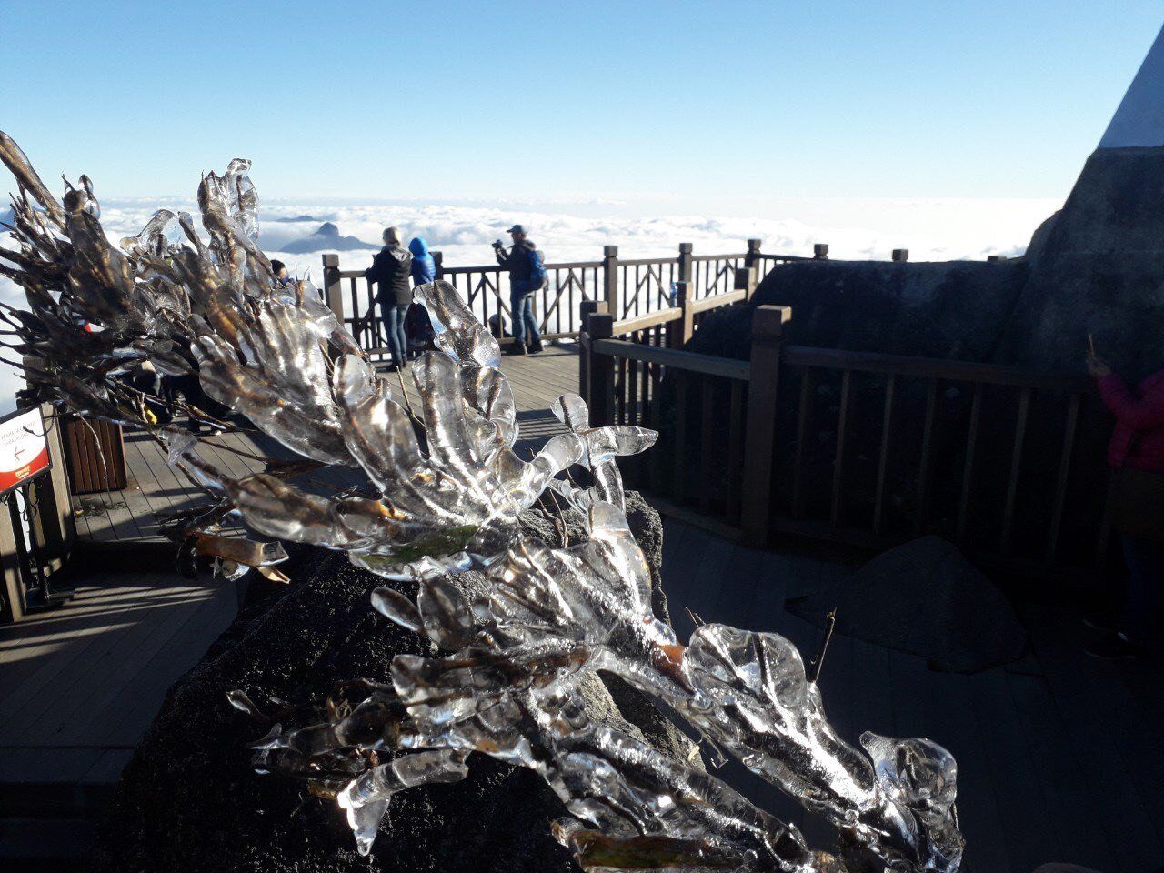 Trong hai ngày 28-29/11, băng giá xuất hiện dày đặc trên đỉnh Fansipan. Nhiệt độ tại đỉnh Fans vào lúc 8h sáng nay là 3 độ C, nhưng khi về đêm nhiệt độ xuống ngưỡng 0 độ C. Khiến sương và nước từ những khe đá đóng băng thành những lớp băng mỏng trên bậc đá.