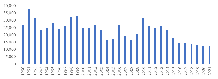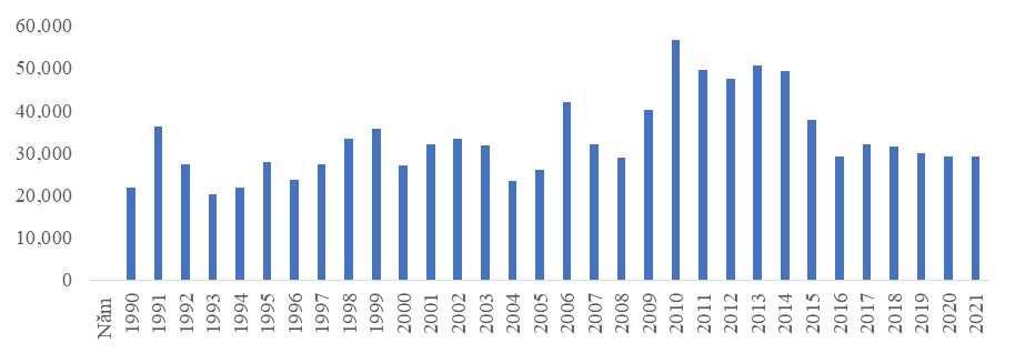 Hình 3.2. Sản lượng thu hoạch thuốc lá ở Việt Nam, 1990-2021 (tấn)