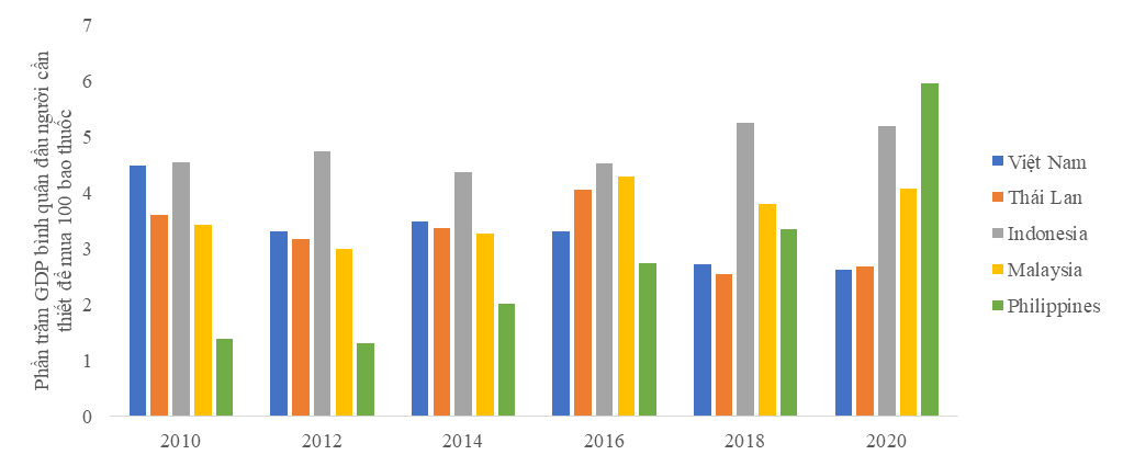 Hình 4.1. Phần trăm GDP bình quân đầu người cần thiết để mua 100 bao thuốc lá của thương hiệu phổ biến nhất tại một số nước Đông Nam Á, 2010-2020 (%)