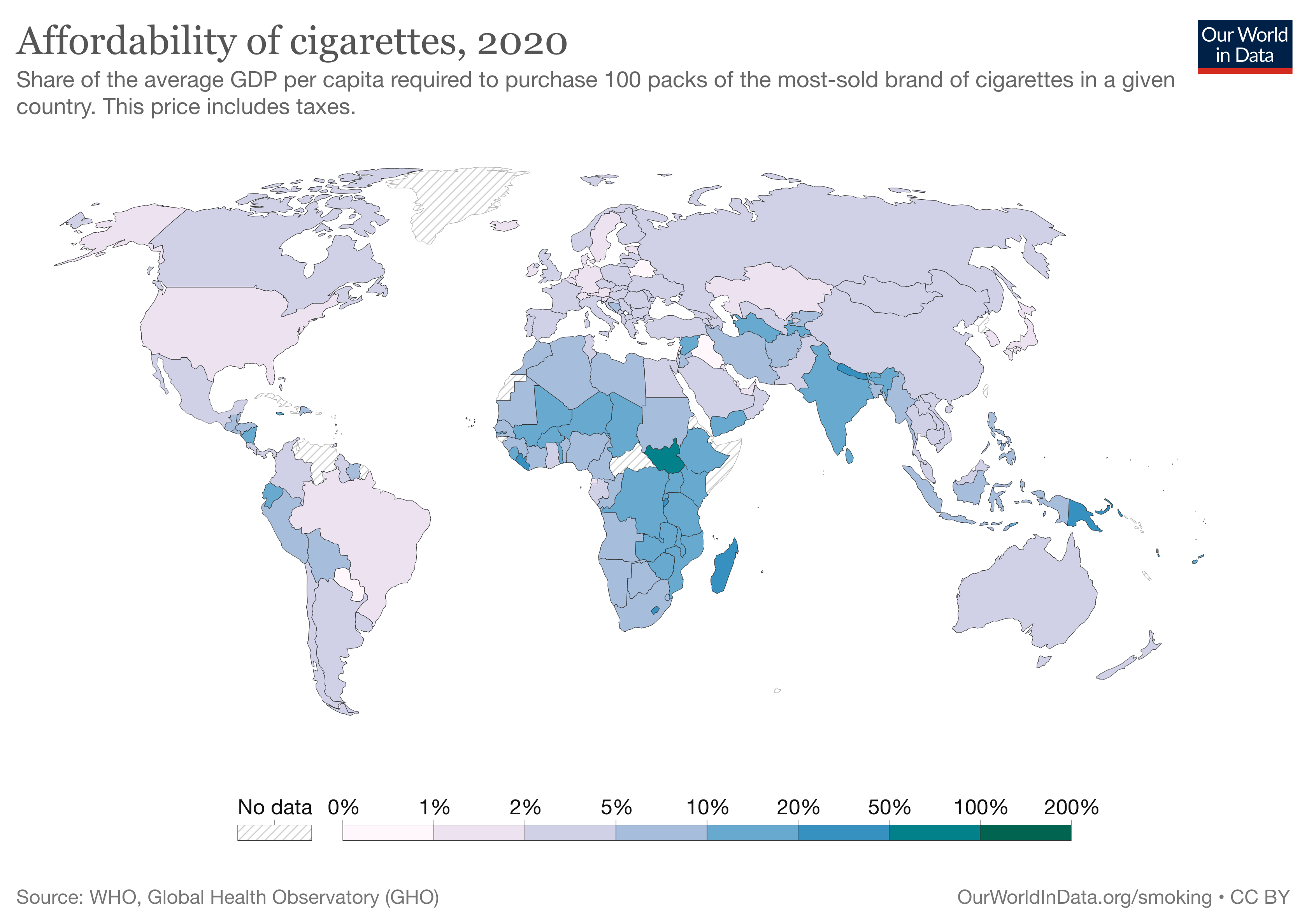 Hình 4.2. Phần trăm GDP bình quân đầu người cần thiết để mua 100 bao thuốc lá của thương hiệu phổ biến nhất trên thế giới, 2020 (%)