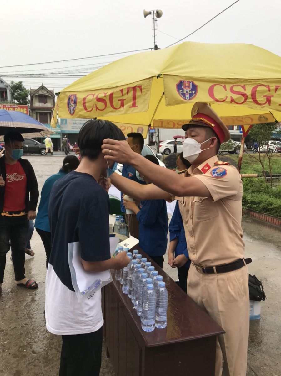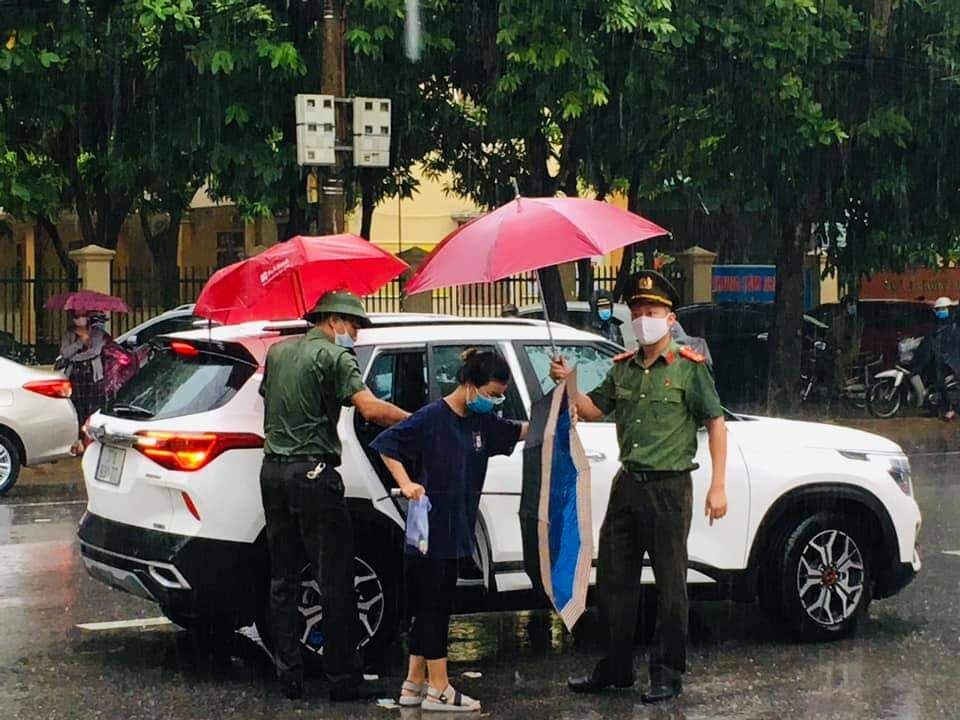 Mặc dù trời mưa to nhưng các em thí sinh được lực lượng Tuổi trẻ Công an đưa đón chu đáo. (Ảnh Quốc Khánh).