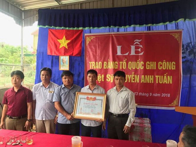 Ngày hôm qua 13/9, Ông Đặng Văn Lập, Trưởng phòng Lao động Thương binh Xã hội huyện Thanh Chương (Nghệ An), cho biết được sự ủy quyền, đơn vị đã phối hợp chính quyền địa phương trao bằng Tổ quốc ghi công cho liệt sĩ Nguyễn Anh Tuấn, trú xã Cát Văn, huyện Thanh Chương.