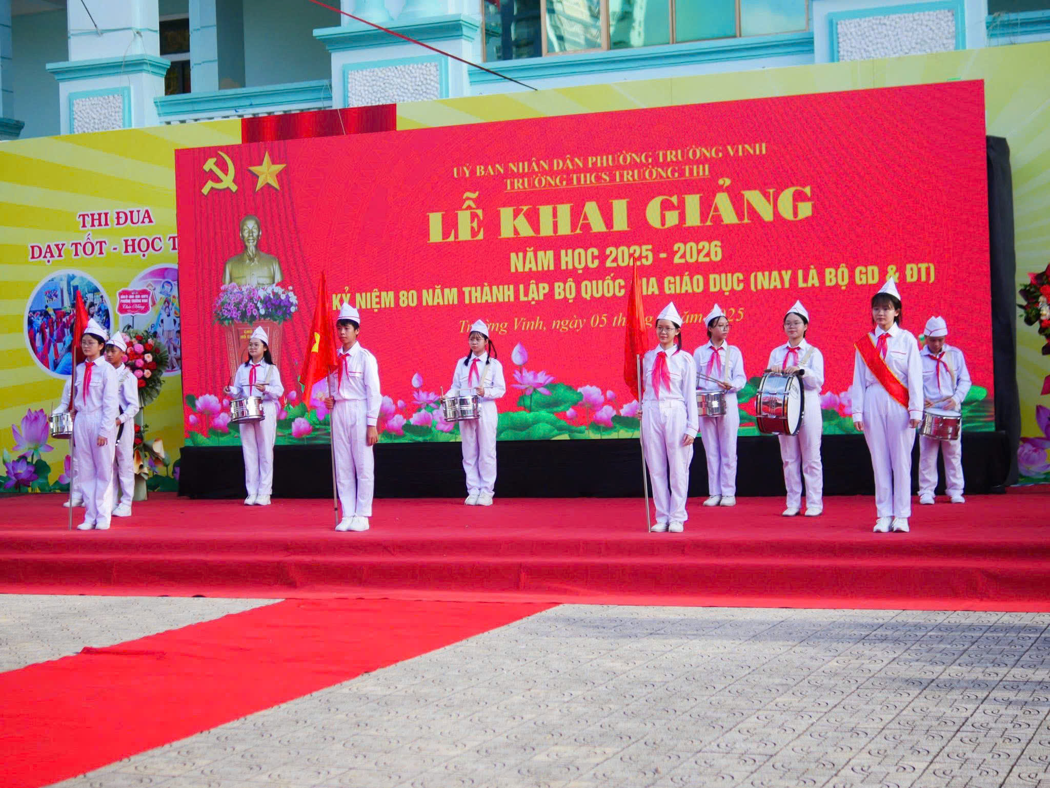 Các Em học sinh Trường THCS Trường Thi, Phường Trường Vinh háo hức trong ngày tựu trường.
