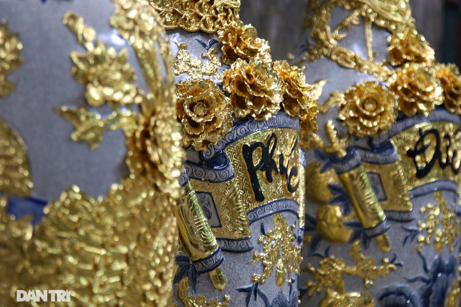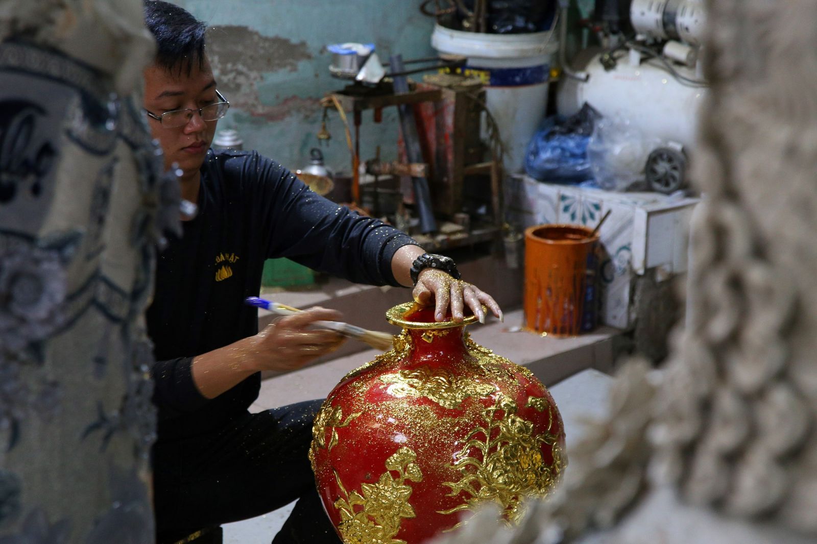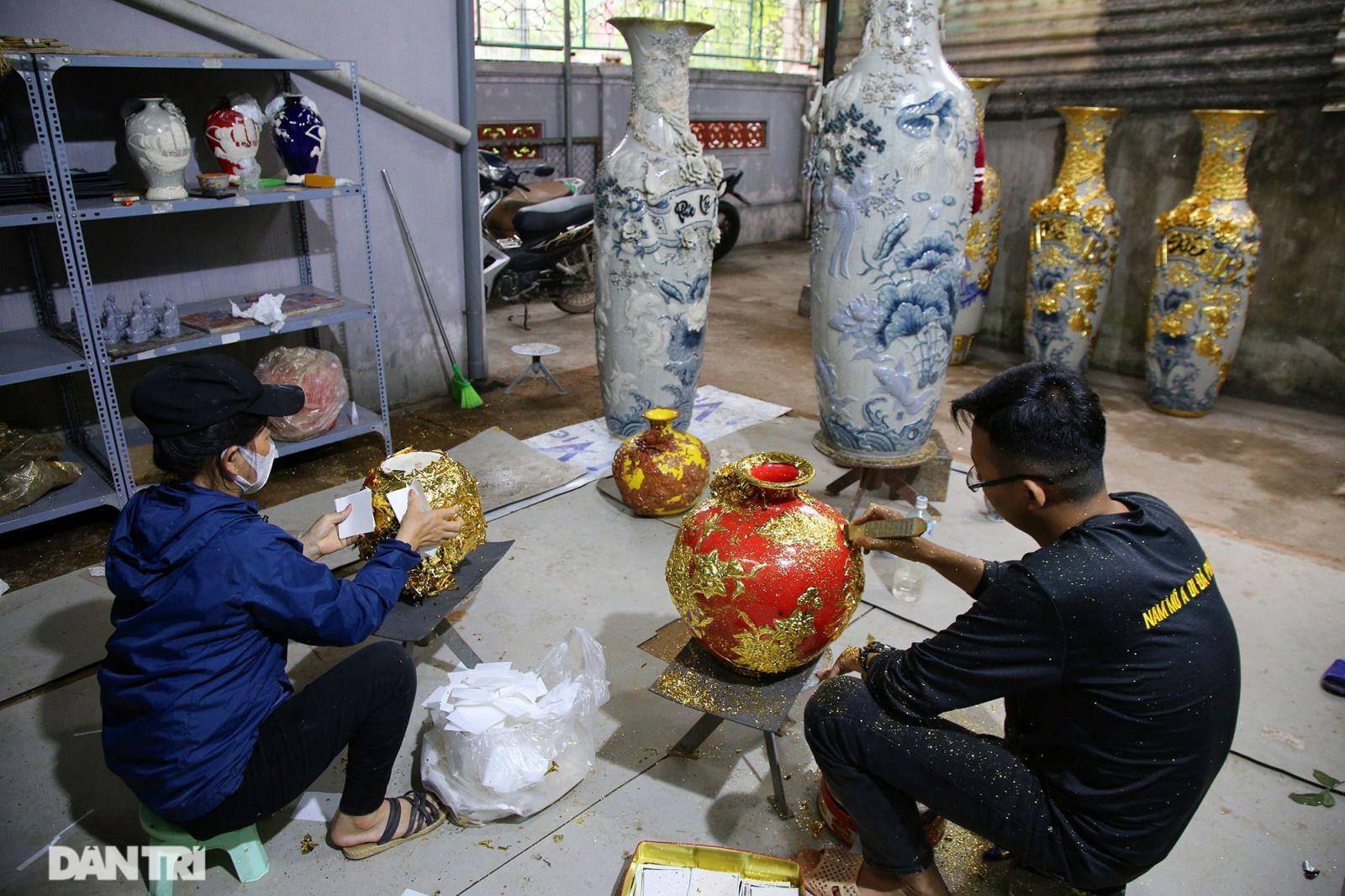 Việc dát vàng trên gốm sứ trải qua nhiều công đoạn. Đầu tiên sơn lót, sau đó "cầm" sơn lên trên phần sơn lót, dán vàng, cuối cùng là dầm vàng. Trong ảnh là công đoạn sơn lót trên bình sứ.