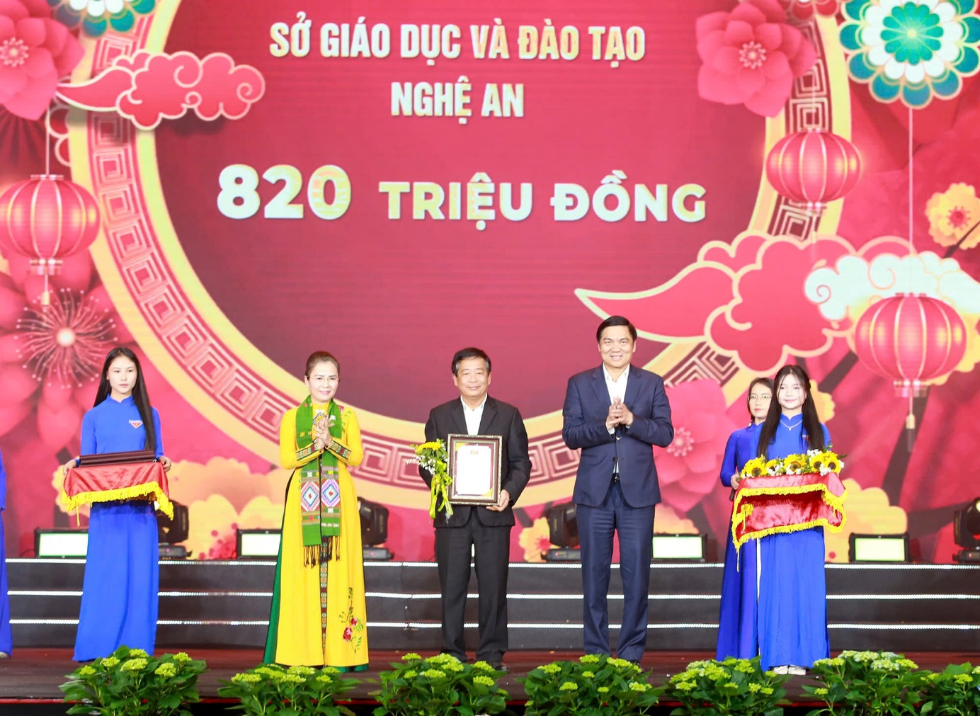 Phó Bí thư Thường trực Tỉnh ủy, Chủ tịch HĐND tỉnh Hoàng Nghĩa Hiếu và Phó Bí thư Tỉnh ủy, Chủ tịch Ủy ban MTTQ tỉnh Võ Thị Minh Sinh trao Giấy chứng nhận và tặng hoa của Ban tổ chức Chương trình cho các tập thể, cá nhân đã ủng hộ người nghèo tỉnh Nghệ An.