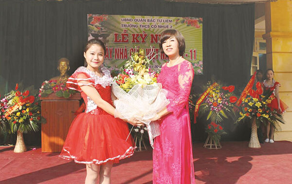 Cô Nguyễn Thị Dung - Bí thư chi bộ, Hiệu trưởng trường THCS Cổ Nhuế 2 nhận hoa trong ngày Nhà giáo Việt Nam 20/11