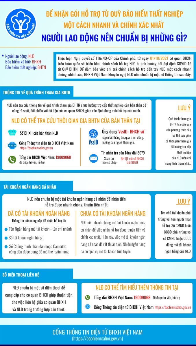 Thực hiện Nghị quyết số 116/NQ-CP của Chính phủ, từ ngày 01/10/2021 cơ quan BHXH trên toàn quốc sẽ triển khai chính sách hỗ trợ người lao động (NLĐ) bị ảnh hưởng bởi đại dịch COVID-19 từ Quỹ bảo hiểm thất nghiệp (BHTN). Để đảm bảo việc chi trả chính sách hỗ trợ đến tay NLĐ một cách nhanh chóng, chính xác, Bảo hiểm xã hội (BHXH) Việt Nam khuyến nghị NLĐ nên chuẩn bị một số thông tin sau đây: