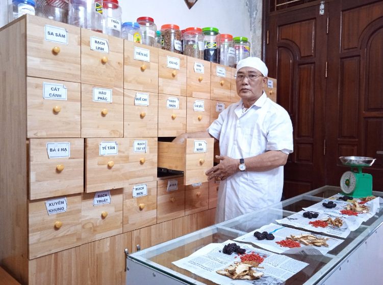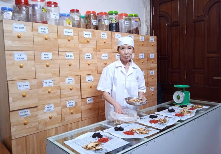 Lương y gia truyền Nguyễn Thị Nụ bốc thuốc chữa bệnh.