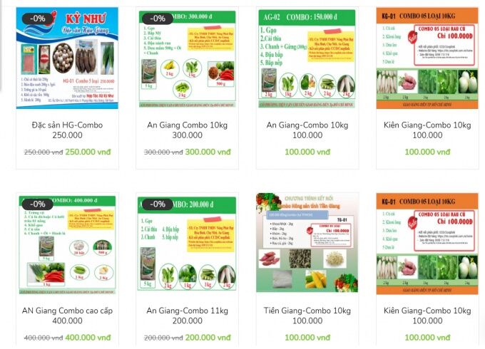 Hiện tại, đầu mối cung cấp các tỉnh đã bắt đầu có nhiều loại hình combo: Combo 4 loại cá của tỉnh Cà Mau: 1kg nục gai, 1kg cá basa cắt khúc, 1kg cá ngừ, 1kg cá chỉ vàng, giá 350 ngàn đồng; Combo 4kg gồm tôm thẻ, mực ống, nục suông, cá điêu hồng của Cà Mau, giá 500 nghìn đồng; Combo đặc sản Hậu Giang: Chả cá thát lát, cá lòng tong 1 nắng, cá lóc non tẩm gia vị, dưa mắm/củ cải muối, trứng vịt cùng dưa leo, đu đủ/bầu bí/mướp… giá 300 nghìn; Combo các loại quả Tiền Giang: Nhãn da bò (4kg), bưởi da xanh (2,5kg), dưa lưới (1,5kg), cam xoàn (2kg), kèm tặng 1kg chanh, giá 250 nghìn; Combo đặc sản Bình thuận: Nước mắm, khô cá chỉ vàng, khô ruốc, khổ qua, cải ngọt, ớt, giá 250 nghìn đồng.