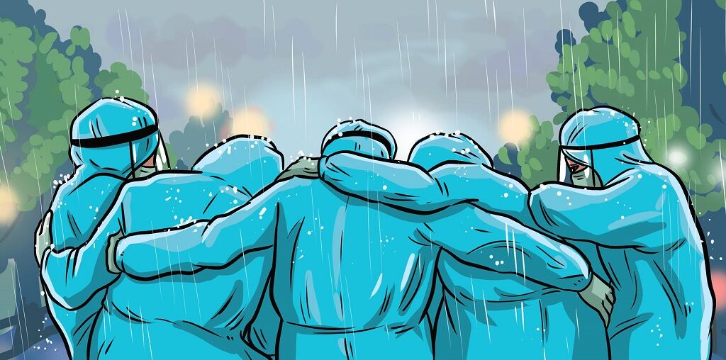 Chẳng hạn như bức vẽ lấy cảm hứng từ một tấm ảnh cảm động về một nhóm tình nguyện viên ở tâm dịch TP Hồ Chí Minh, họ mặc đồ bảo hộ xanh, ngồi trên thùng xe bán tải, cúi người và khoác chặt vai nhau dưới cơn mưa tầm tã. Bức ảnh gốc lột tả sự khốc liệt của “cuộc chiến” chống dịch, khi chuyển thành tranh vẽ trở nên nhẹ nhàng, tươi sáng hơn, dịu bớt đi những căng thẳng trong thời gian dịch bệnh mà vẫn truyền tải được thông điệp nhân văn sâu sắc.