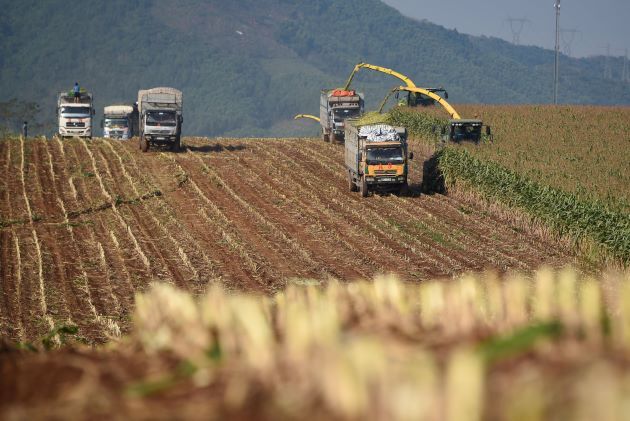 VNHN - 5 cỗ máy khổng lồ hiện đại với khả năng cắt, nghiền liên hoàn có thể thu hoạch được gần 3.000 tấn ngô sinh khối mỗi ngày trên cánh đồng nguyên liệu rộng 150 ha của TH true Milk tại Nghĩa Đàn, Nghệ An.