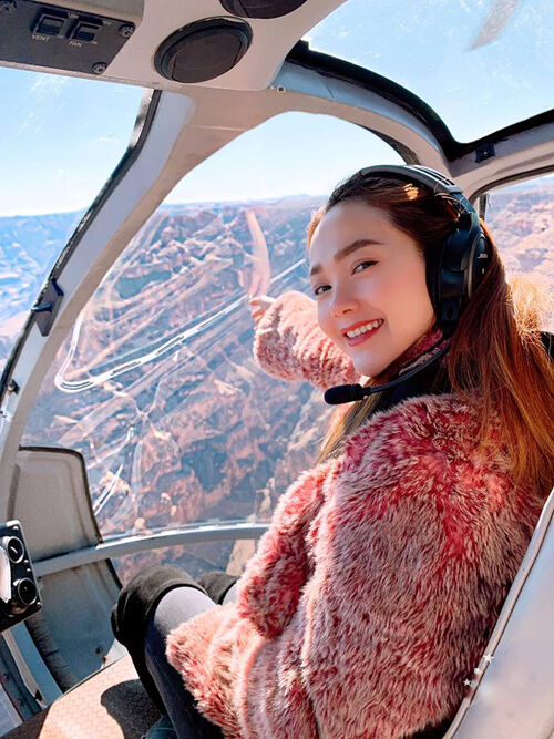 Minh Hằng cũng lựa chọn Mỹ là điểm đến du xuân đầu năm để lấy may. Cô khoe ảnh đi máy bay trực thăng, ngắm cảnh ở Las Vegas, trước đó là Nevada. "Du xuân nên cũng phải kiếm chỗ nào màu sắc cho hợp với không khí lễ hội. Seven magic mountains giữa sa mạc Nevada là điểm nhấn khá thú vị và lạ mắt", "bé Heo" chia sẻ