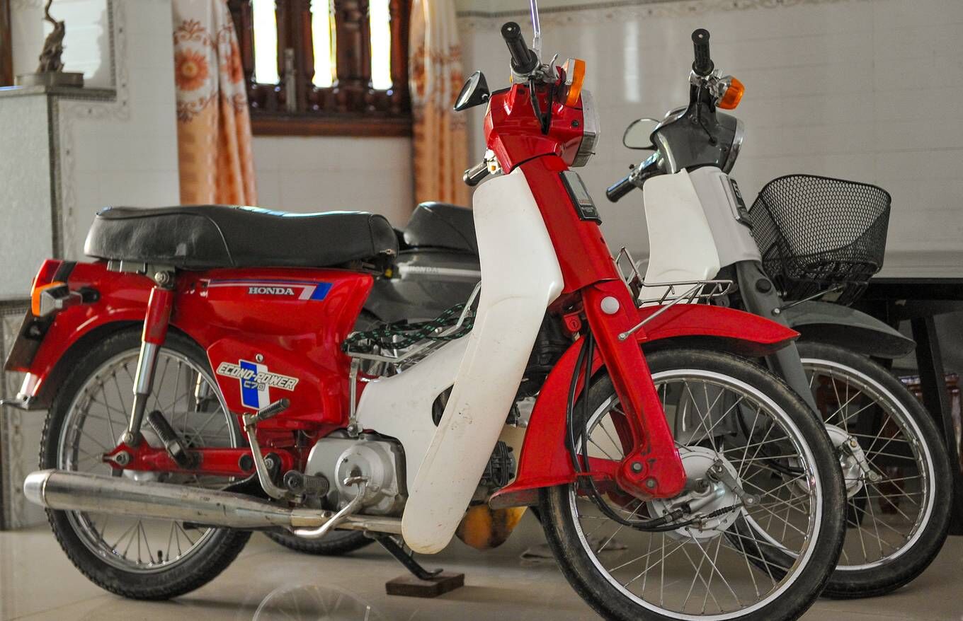 Hai chiếc xe máy ông thường đi lại trong lối xóm giờ cũng dựng yên ở góc nhà.