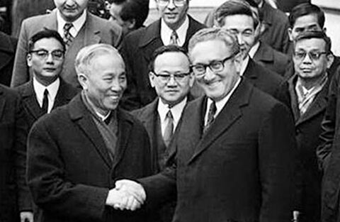 Cố vấn Lê Đức Thọ và cố vấn đặc biệt của Tổng thống Mỹ, tiến sĩ Henry Kissinger chúc mừng nhau sau lễ ký tắt. Ảnh tư liệu.